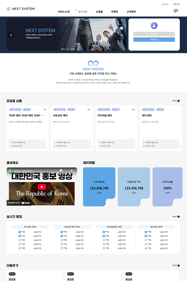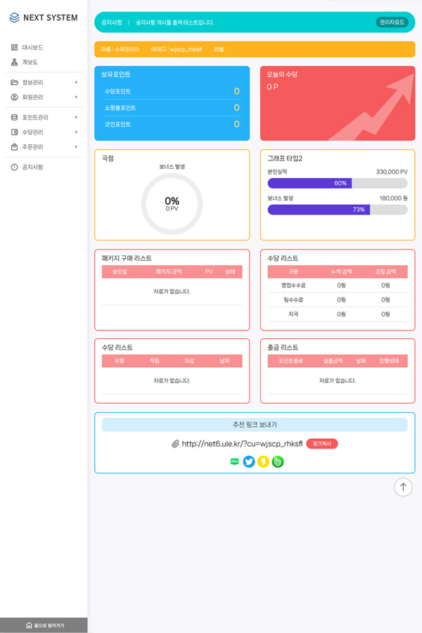 | 추천수당 | 수당을 지급할 추천인 대수 및 % 설정 하면 매일 자동으로 지급됨 |
