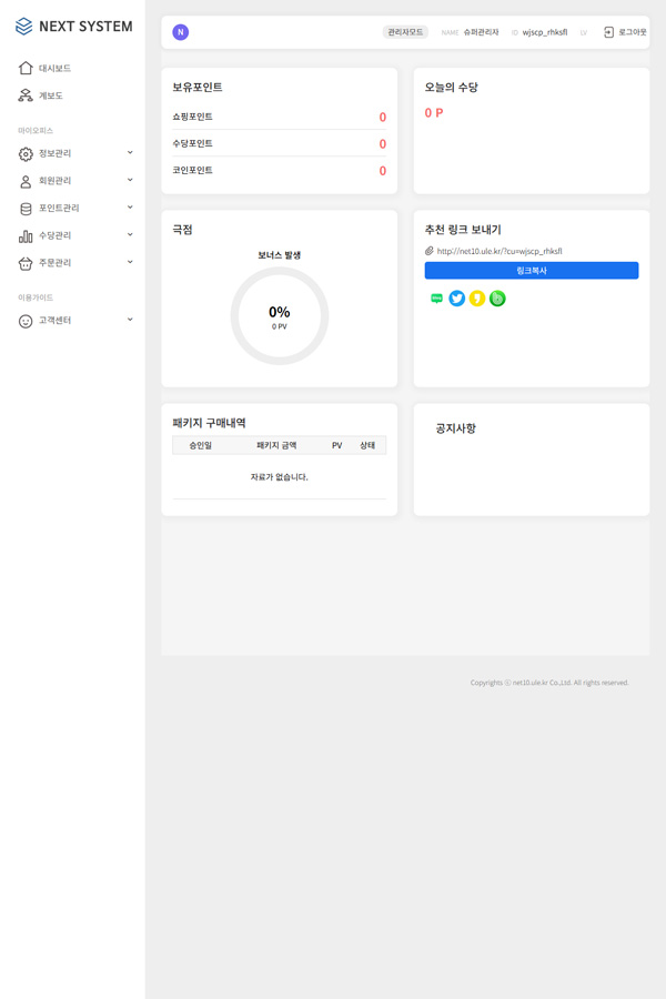 추천인 및 후원인을 변경할수 있고 라인전체를 다른라인으로 이동가능 회원한테 포인트 지급 및 회수가능 일자별,아이디,이름,회원등급,추천인,가입일,산하회원수등 검색가능 회원별 통합 포인트내역 조회기능 회원리스트 엑셀 다운로드 기능 네이버, 카카오, 페이스북 소셜 로그인 제공 |
