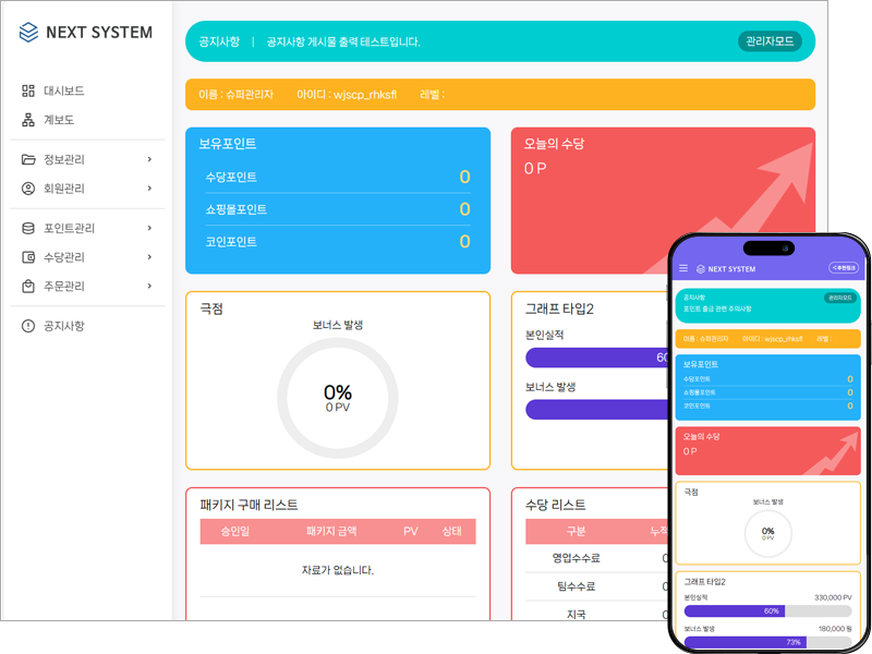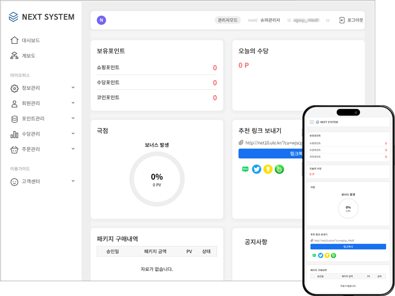 아래 기재된 정보로 로그인 하시면 회원 계보도 및 회원 관리 페이지를 보실수 있습니다. 수당관리는 업체에 맞게 프로그램 해 드립니다. 주문관리는 데이터가 있으면 자세하게 나옵니다. 디자인은 원하시는대로 해드립니다.